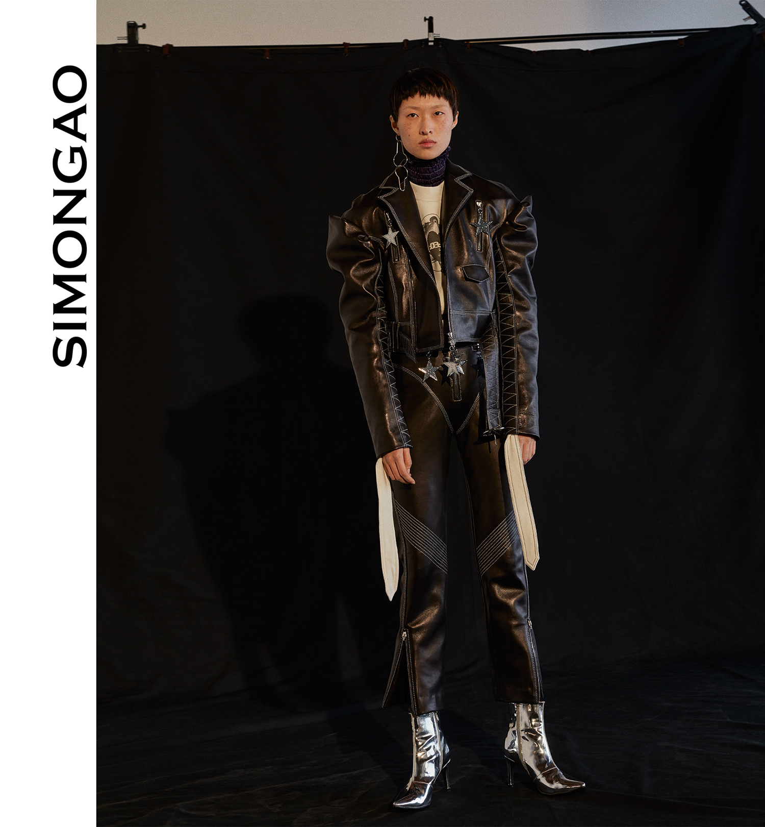 SIMONGAO 融合全球先锋的当代艺术,文化,音乐等截然不同的元素,追求变革和创新,在设计作品中结合典雅且极具前卫冲击力的强势风格,干净利落的剪裁,搭配软硬材质的对比和高级时装面料与打破常规的新型材质的拼接,创造出现代感十足的廓形,超现实的先锋摩登华丽感,将个性自由、不羁表现的淋漓尽致,展现出一个极具独立个性魅力及充满力量感的女权主义形象。SIMONGAO的标识性处理如边沿的缝合,胶印,拉链及金属配件,车线等都具有强烈的标识性,体积感的短夹克,宽松剪裁的阔腿裤装等都是 SIMONGAO极具特色备受追捧的经典时髦单品。