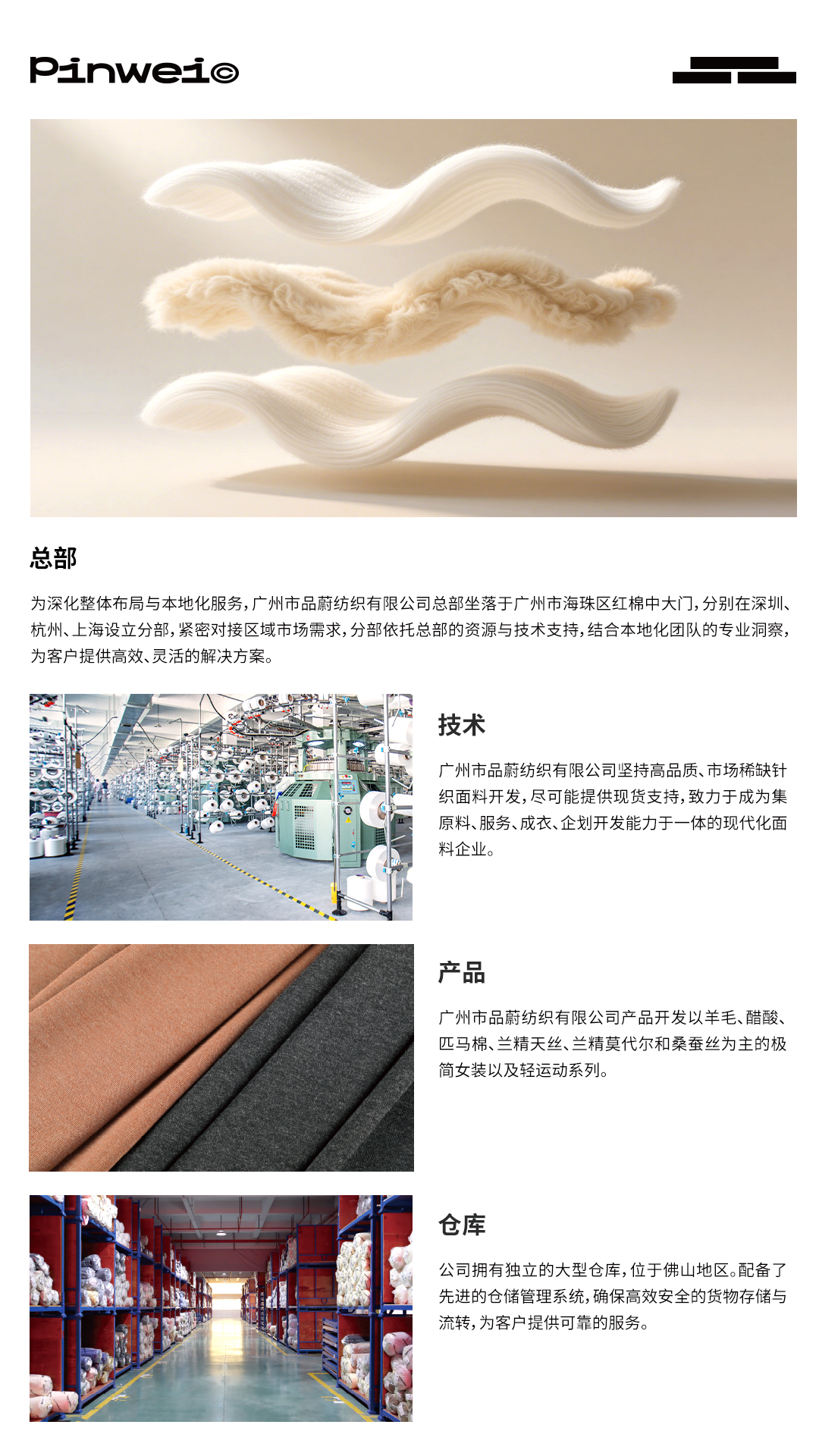 广州市品蔚纺织有限公司坚持高品质、市场稀缺针织面料开发,尽可能提供现货支持,致力于成为集原料、服务、成衣、企划开发能力于一体的现代化面料企业。
