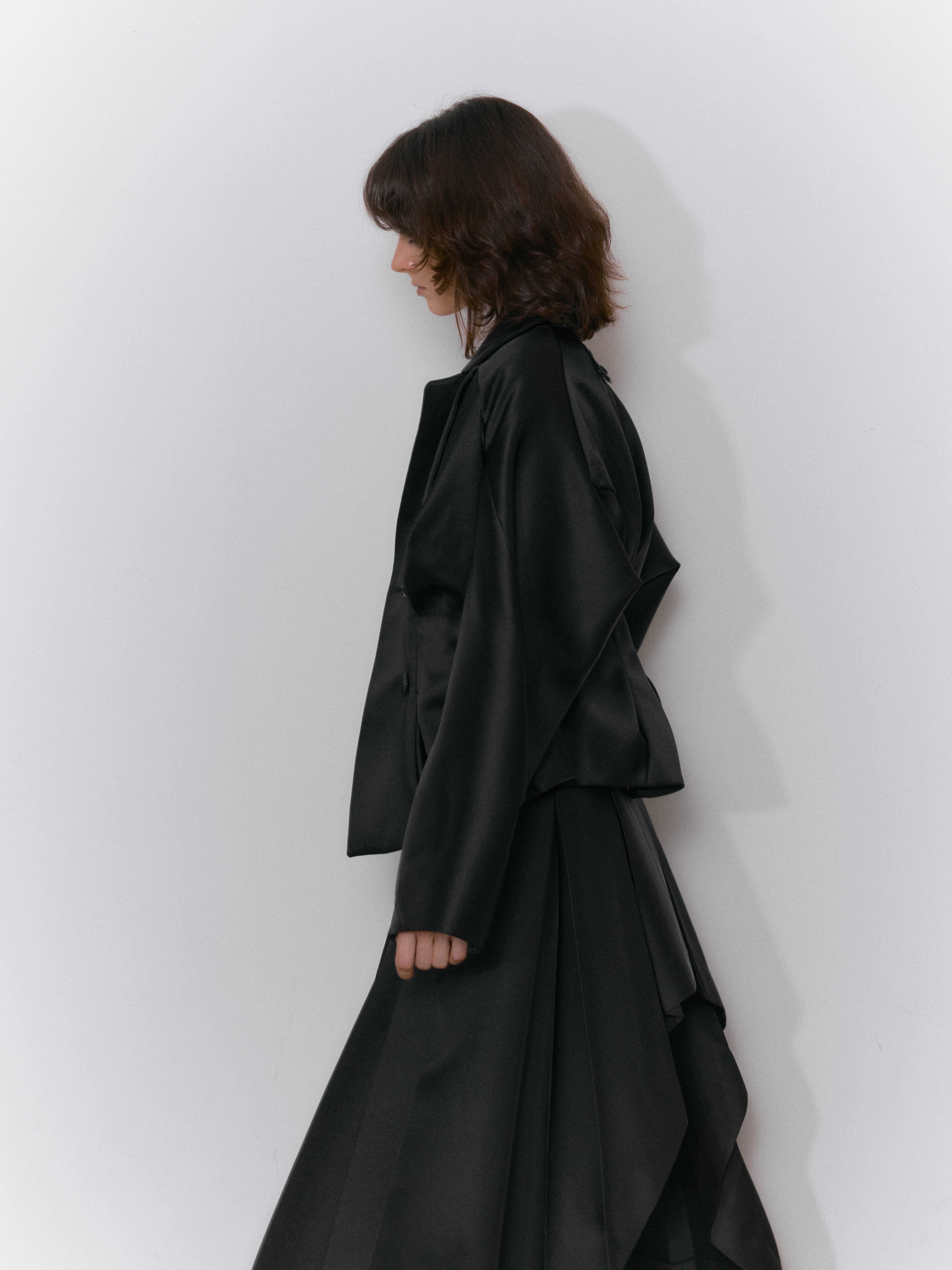 ODE TO THE TURBID OCEAN名称源自英国浪漫主义诗人Percy Bysshe Shelley的诗歌《Ode to the West Wind》如同诗人在诗歌中对“西风”的赞颂一般,在浑浊的世界中试图超越平凡,保持纯粹的自我。品牌风格以结构性设计为主,通过裁剪充分展现出面料本身的美感与质感,统一服装上的视觉完整性,将锋利的轮廓与面料的柔软完美结合,专注于服装与面料本身。
